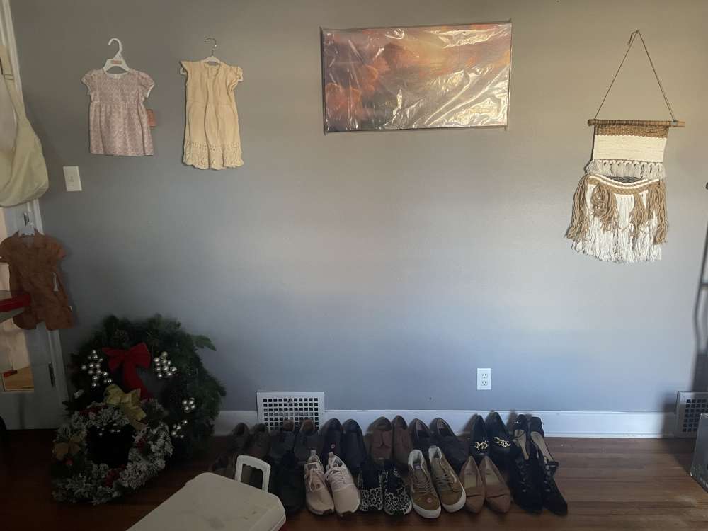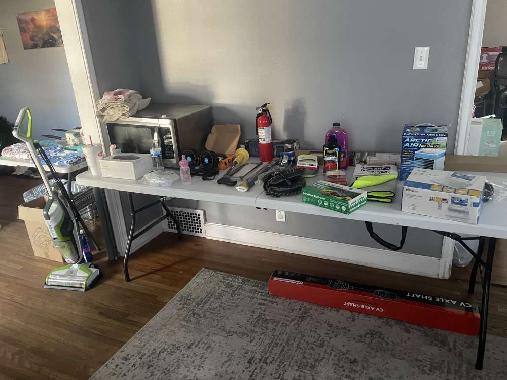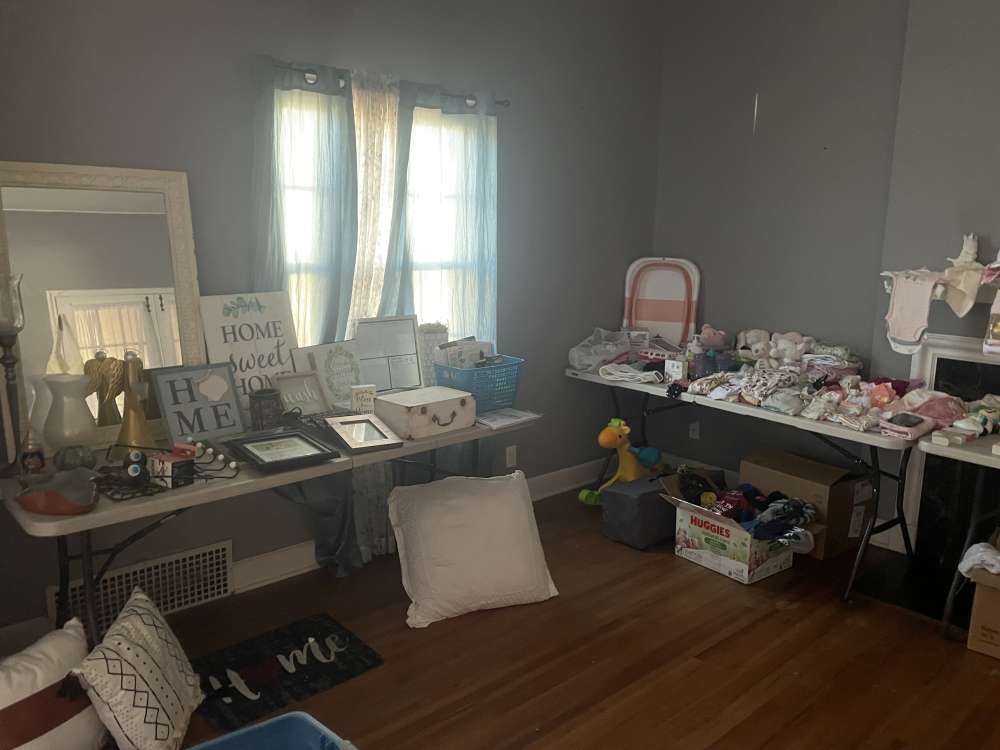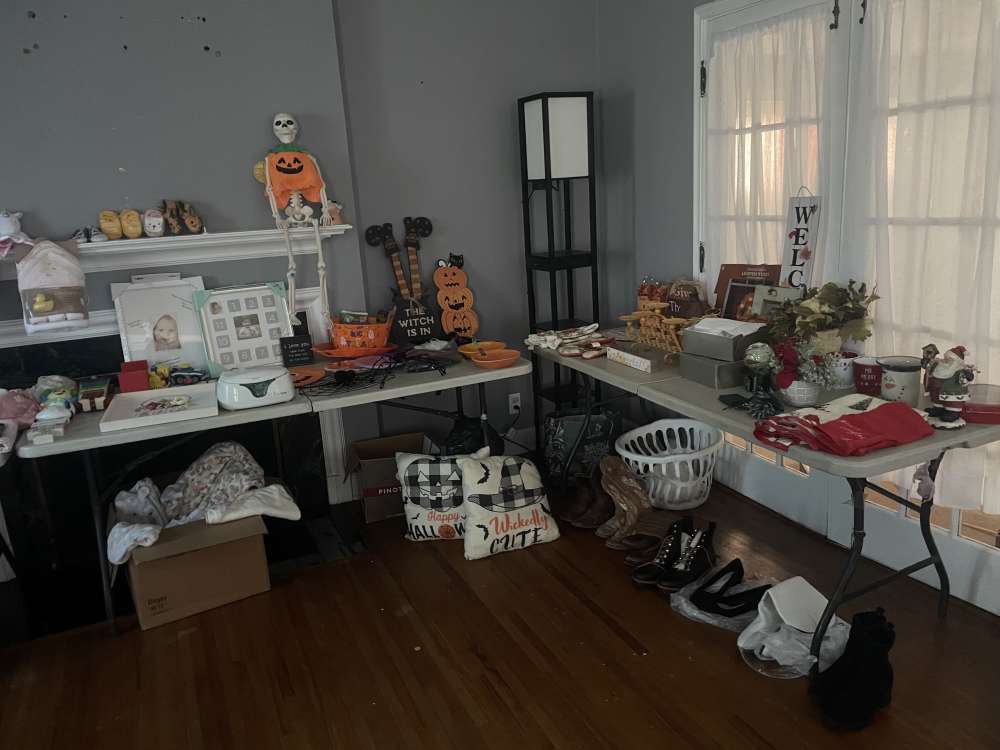 A little bit of everything. Baby items/clothing. Kids toys, adult shoes/clothing, household items, tools, seasonal decor, oven/stove, lots of random items. More items in garage than what is in pictures.
