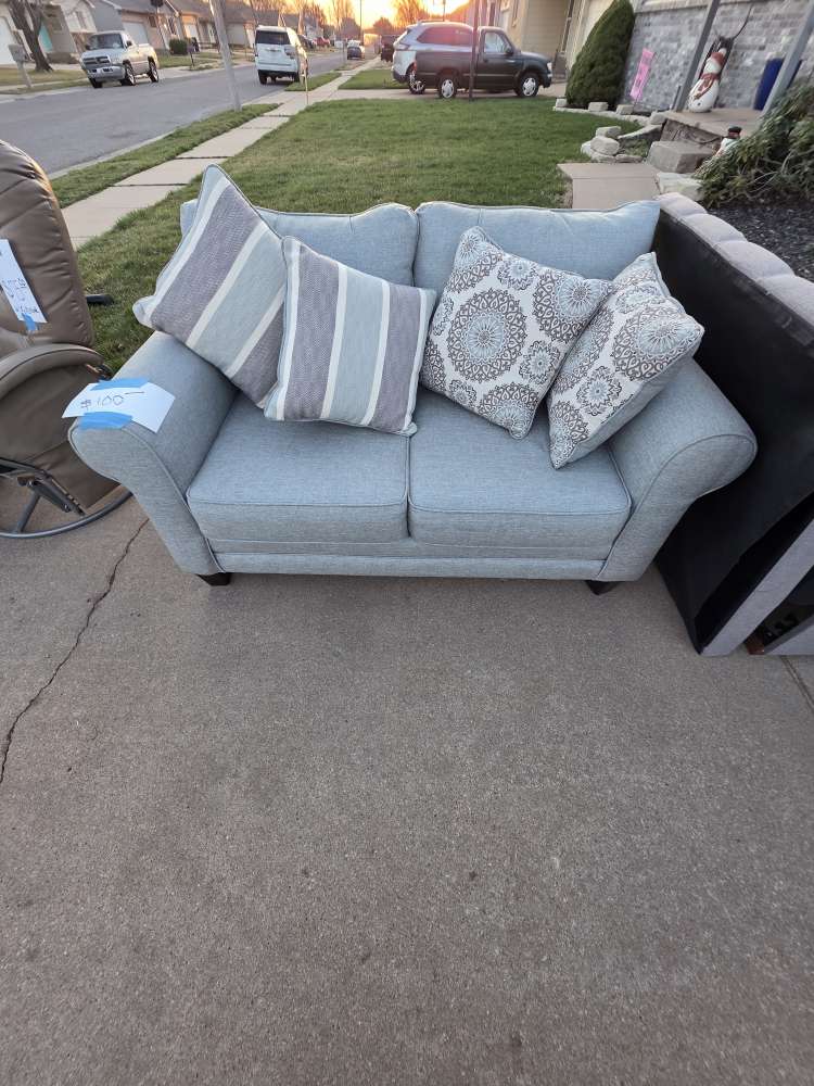 8 am - NOON - ABSOUTLEY NO EARLY SALES -- Very nice Twin bed with head board. Twin Mattress & box springs EXCELLENT CONDITION. 2- Dressers not items on dresser, 1-Night Stand, several table lamps, Excellent Condition Occasional chair rocks/swivels reclines with ottoman. EXCELLENT CONDITION Love Seat. 42" LG NOT a smart TV WORKS GREAT. 5 shelf Etagere Display 4-glass shelfs 1-rattan shelf frame is decorative Pewter Metal.