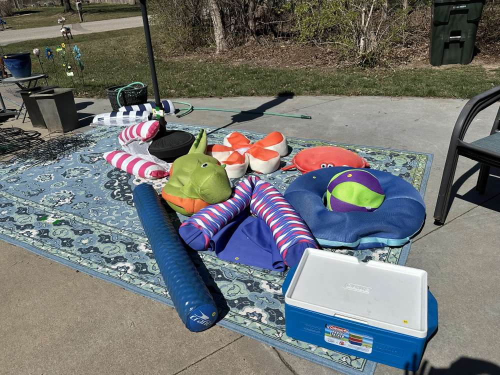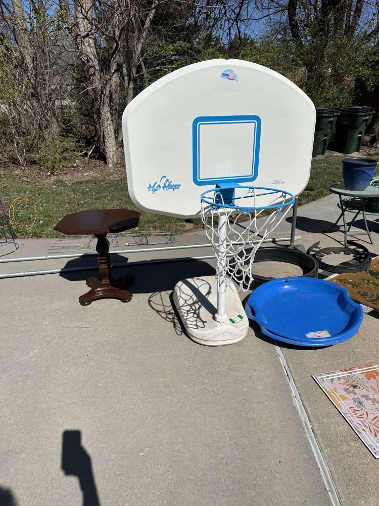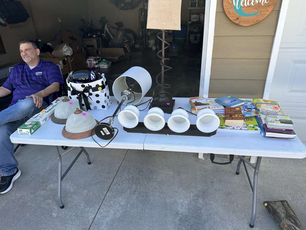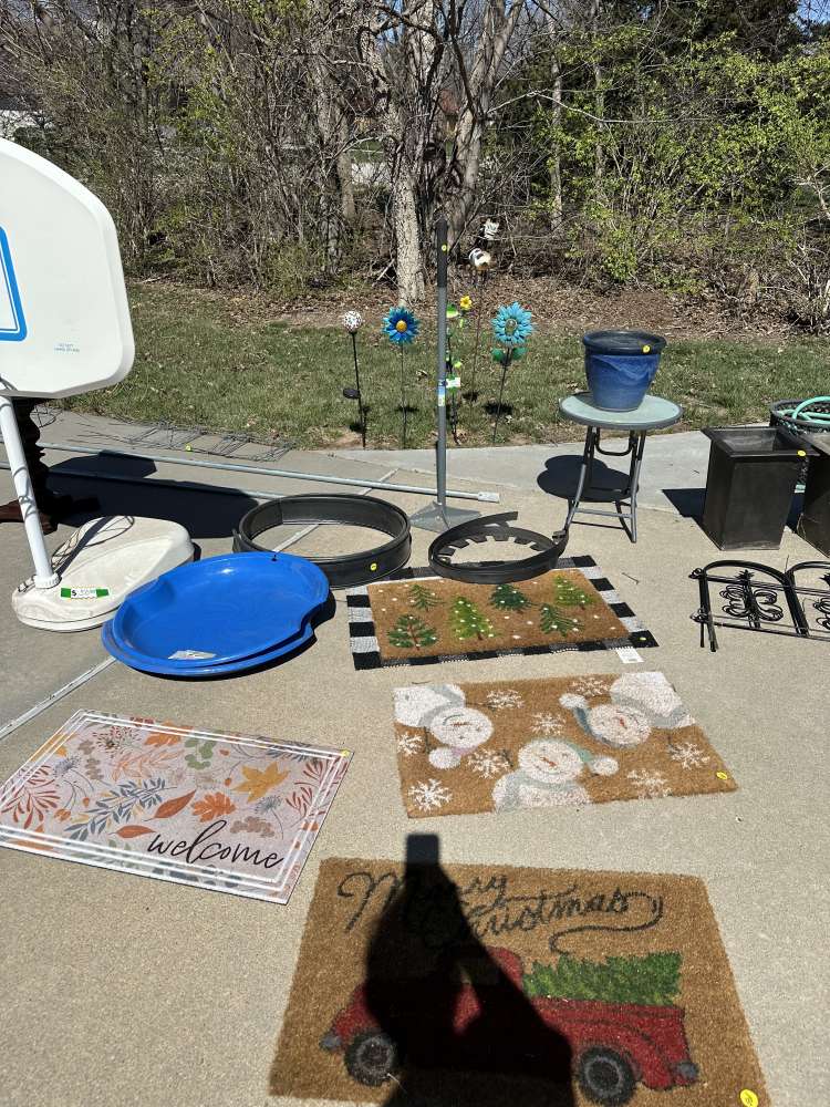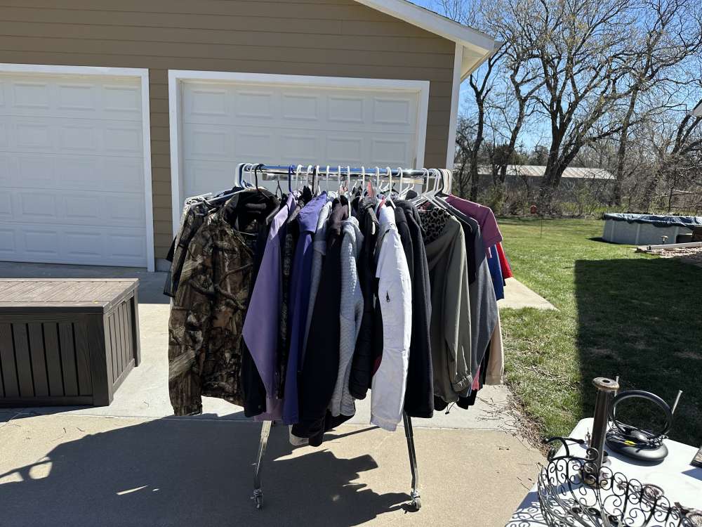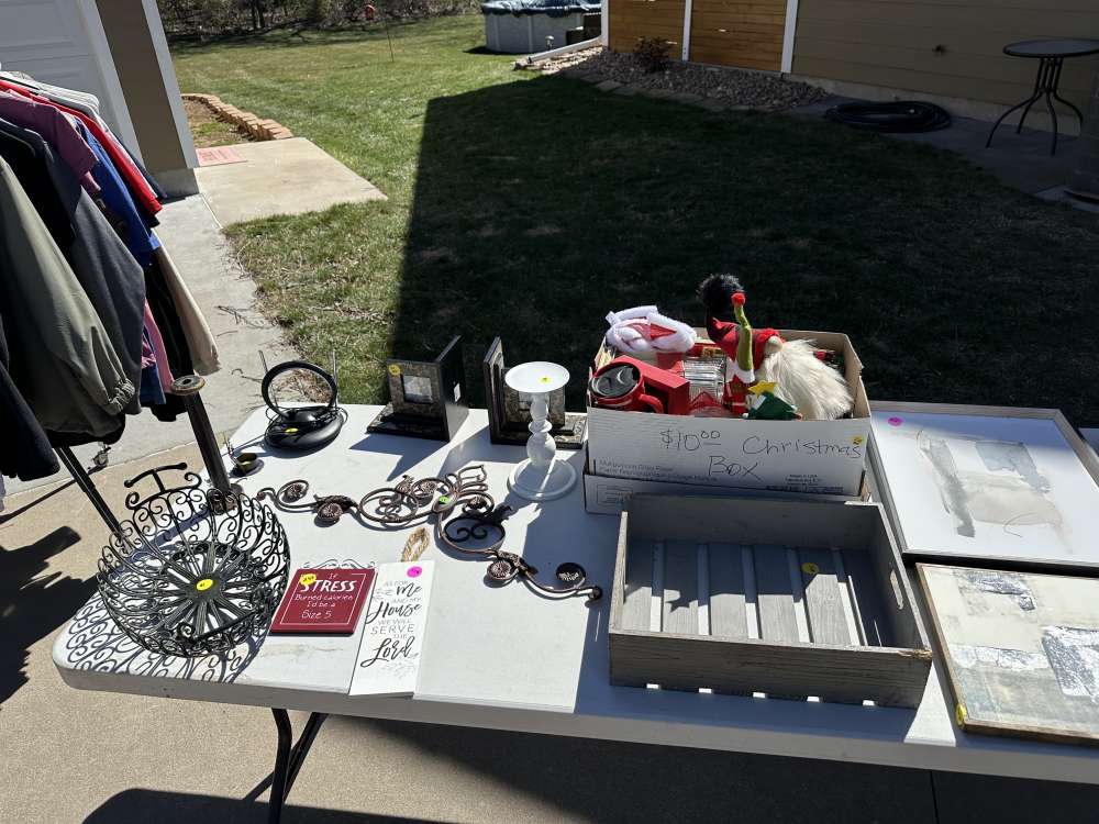 Kitchen table and leaf, plus four roller chairs, nice patio table, four chairs and umbrella, solid oak tv console, rocking chair, nice Eddie Bauer ladies tops and pants Christopher Banks, Birkenstock brand new sandals, Vera Bradley purses, Brighten jewelry, Easter baskets, table linens, bread machine, stand mixer, kitchenware, home decor, thirty one bag, yard tools, lawn chairs lamps end tables and much much more!!