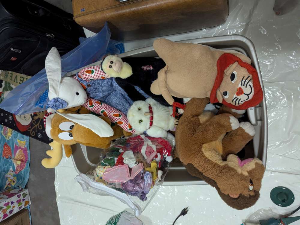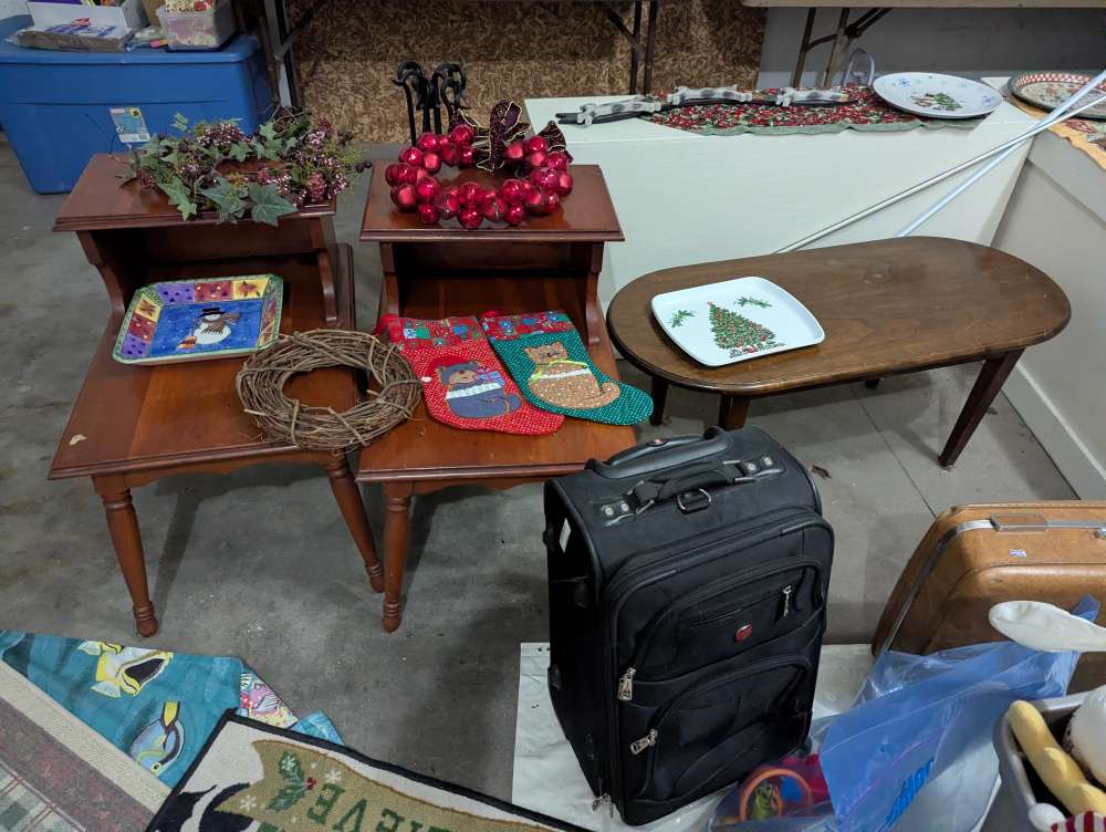Christmas and Halloween decorations, end tables, crafts, play pen and jumper, yard tools etc.