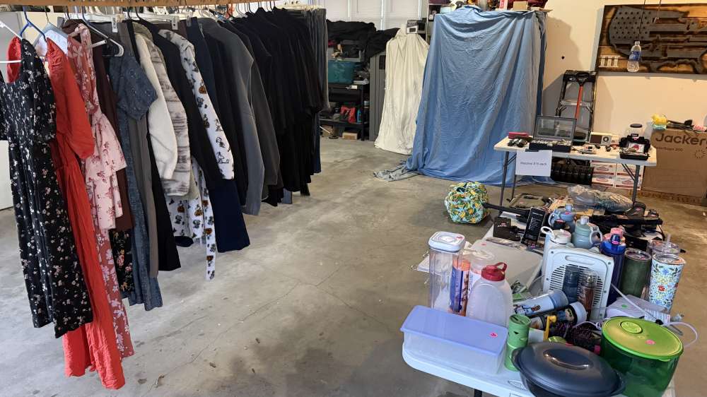 Sale starting at 7 a.m. till early afternoon on SATURDAY ONLY: Ladies clothing size small up to large, Big mens 5XL, 6XL, 6XLT clothing (all from DXL: Reebok, Adidas, Lucky jeans), TV, computer monitors, surround sound, fit bit charge 6, kitchen items, watches, sunglasses, car cover for mini cooper sized vehicle, cookbooks, pocket knives, EDC gear, adding more!